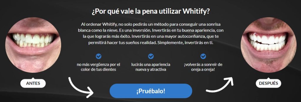 Al comprar Whitify en España, se asegurará de blanquear sus dientes y recuperar la confianza en sí mismo. Aún debe saber que este producto no es peligroso para los dientes y no tiene efectos secundarios a diferencia de las tabletas o medicamentos que se venden en las farmacias. Así que puedes tener Whitify sin ninguna receta o consejo médico.